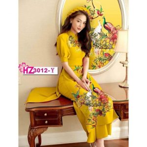 AD2188 Set bộ áo dài truyền thống cách tân cổ trụ họa tiết hoa chim công