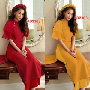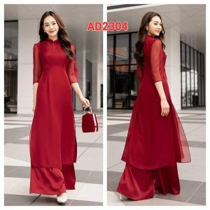 AD2304 Set bộ áo dài truyền thống cổ trụ 4 tà đính hạt vai bèo