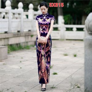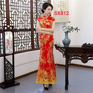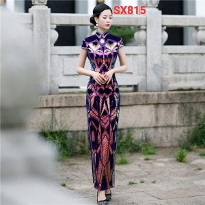 SX894 Sườn Xám Cổ Tàu Hoa Dáng Dài